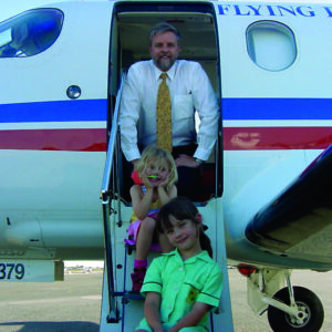 Elizabeth’s husband Dr Stephen Langford (then Medical Director at RFDS): with a new Pilatus PC-12 aircraft, accompanied by daughters Josephine and Katherine (Nov 2001).